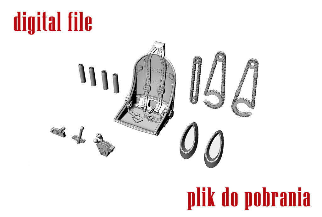 - Includes: seat with harness, exhaust pipes, landing gear opening mechanism chains, cockpit control lever set, and gun barrels.