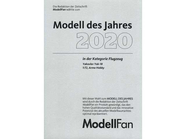 German modelling magazine Modell Fan awarded Yak-1b model with Model of the Year 2020" medal. Award is granted yearly during the Internation Toy Fair in Nuremberg (Germany).
