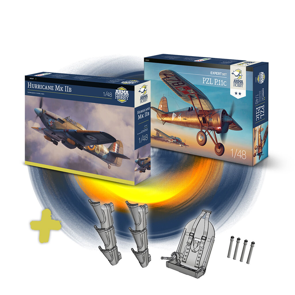 - 1/48 Hurricane IIB with 40007 set of 3D-printed resin accessories + 1/48 PZL P.11c Expert 40001