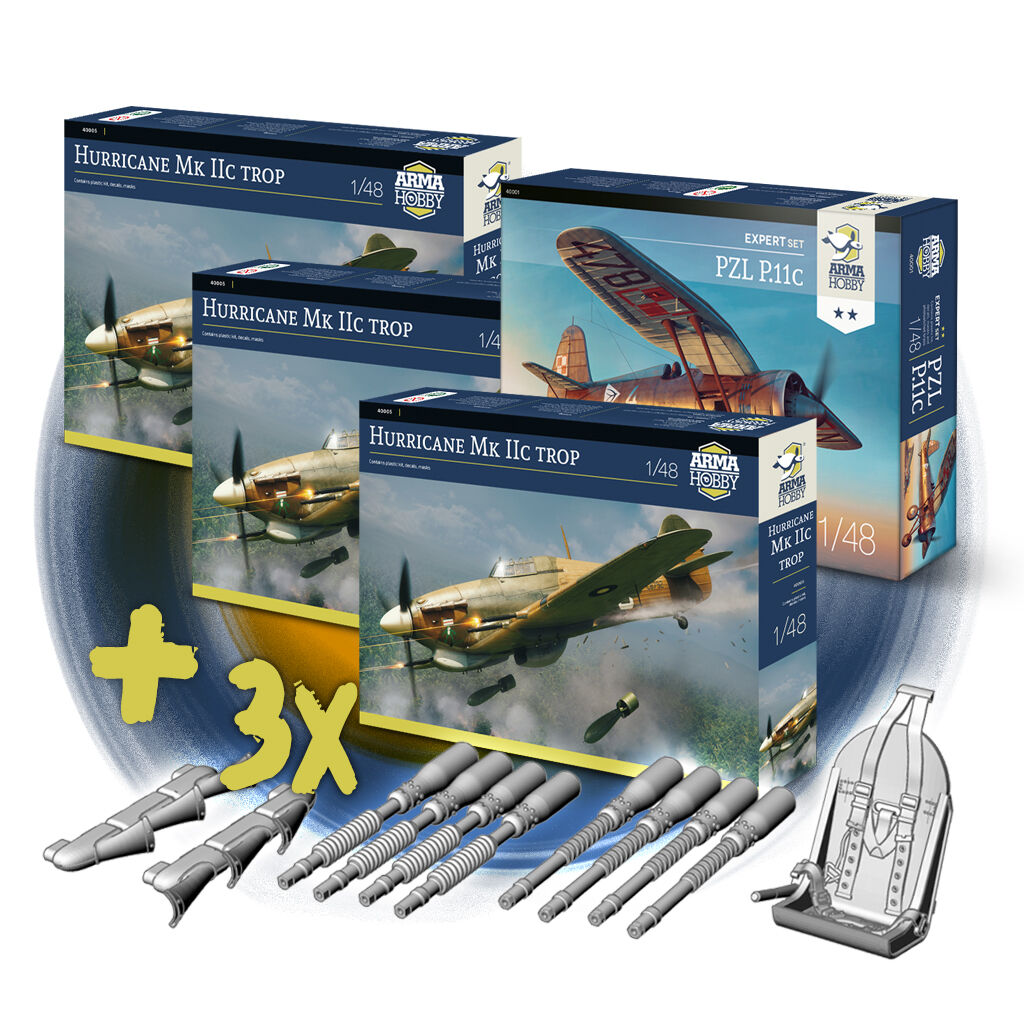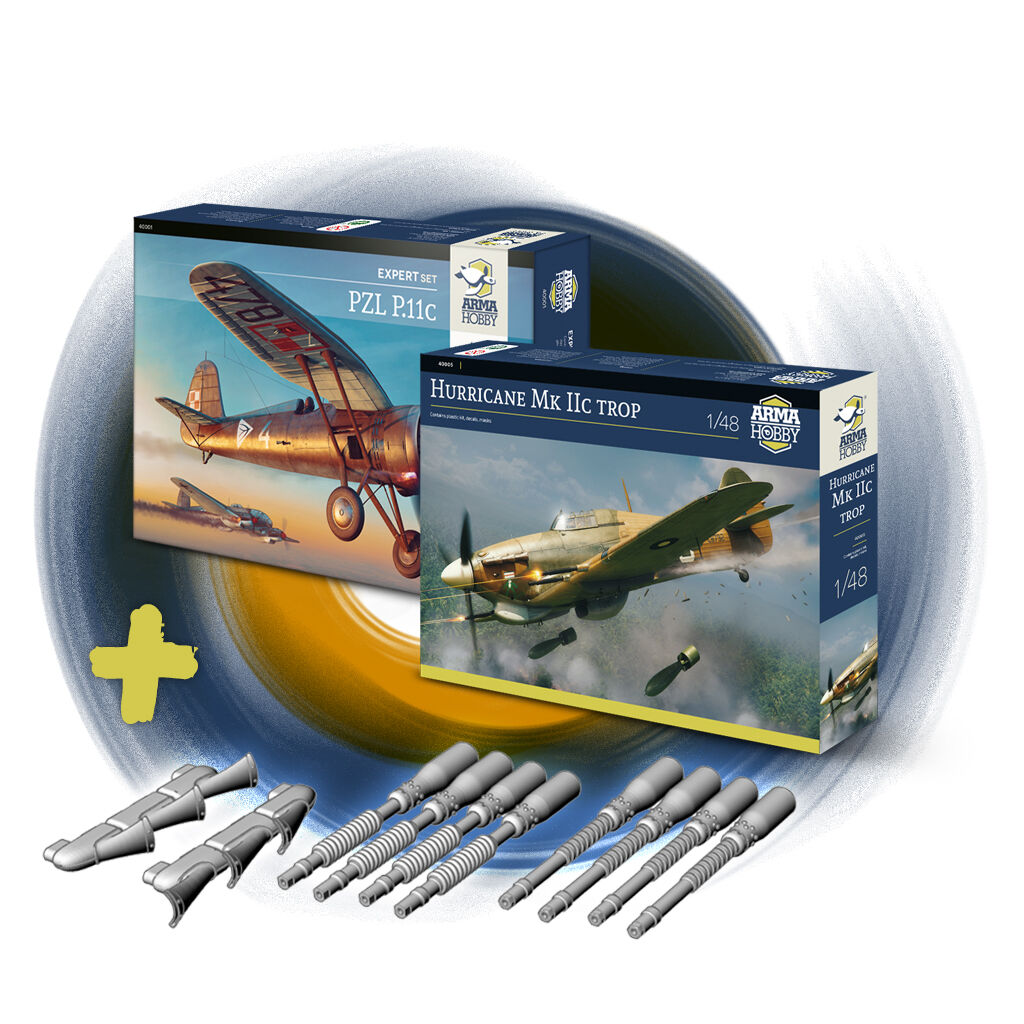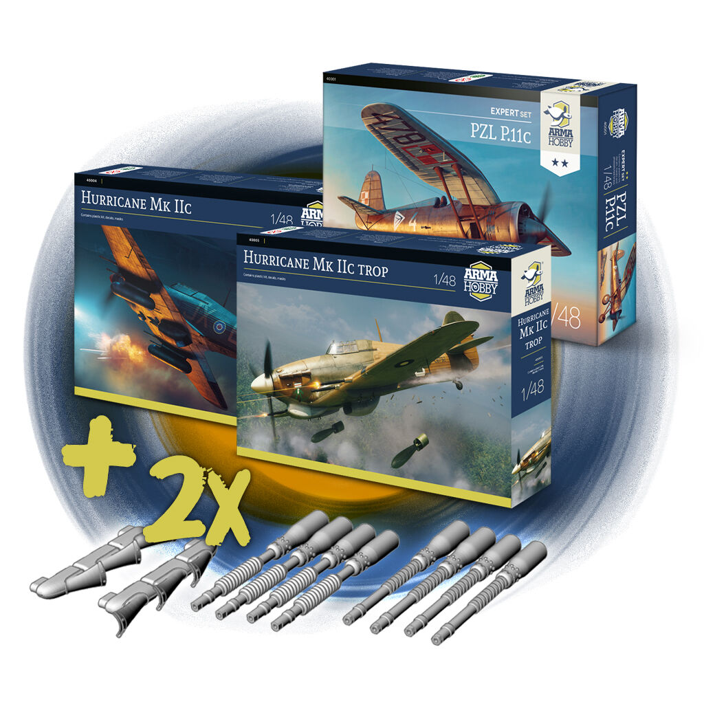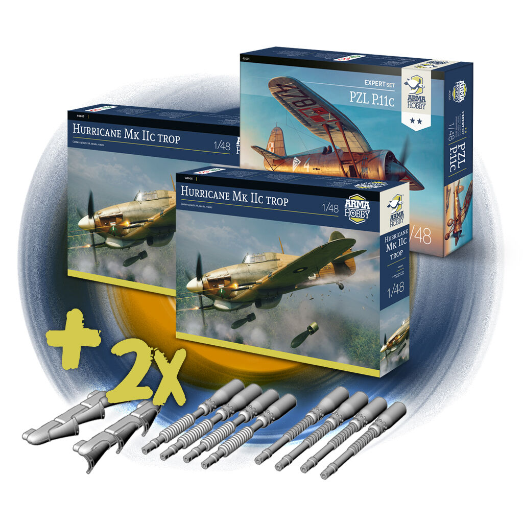 Additionally in the promotion: bundles of 1/48 Arma Hobby model kits: Hurricane Mk IIc trop and PZL P.11c, and Hurricane with Master metal barrels at a discount.