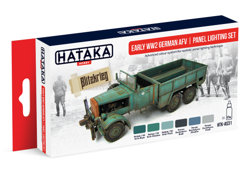 HTK-AS31 contains 6 paints thoroughly composed for use in panel lighting technique on models of Early WW2 German AFVs.