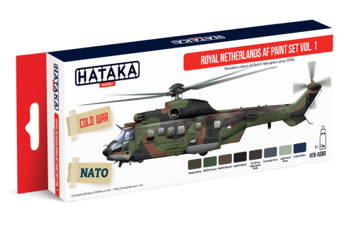 For a long time the Royal Netherlands AF helicopters (Alouette IIIs and Bo-105s) used a single-colour RAL6014 scheme (in early 1980s black paint was added in order to improve scheme effectiveness). In mid-1990s Bo-105s moved to tri-colour "NATO scheme" of RAL6031, RAL8027 and RAL9021. The same colours were adopted for AS532U2 Cougar Mk2s. CH-47D Chinooks used overall FS34094 green, while AH-64D Apaches wore standard FS34031 "Helicopter Drab". Only recently overhauled AS532U2 Cougar Mk2s and newly delivered CH-47F Chinooks presented a new colour of FS36118. Apart from the above mentioned colours the set also includes FS36440 - overall colour of the Dutch NH90 NFHs, and RAL5013 - the famous blue colour of "Royal Flight" Alouette IIIs.